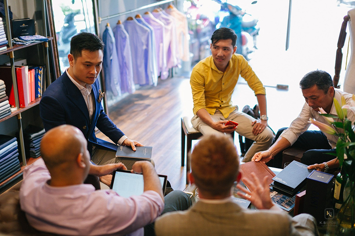 Kim Bespoke lựa chọn lắng nghe và thấu hiểu như một người bạn, để có thể tư vấn cho khách hàng như một chuyên gia, dựa trên kinh nghiệm được hun đúc từ hệ tổ hợp 1000 màu sắc, 100 hoạ tiết, hơn 40 số đo, kết hợp cùng chất liệu vải cao cấp từ các thương hiệu danh tiếng của Anh, Ý và Pháp như Holland & Sherry, Cerruti hay Dormeuil.