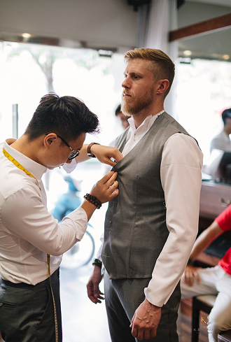 Khách hàng của Kim Bespoke đều là những chú rể đang tất bật chuẩn bị cho ngày trọng đại của mình. Chúng ta thường hướng sự tập trung về những bộ cánh lộng lẫy của cô dâu, vô hình trung khiến hình ảnh của nam chính có phần nhạt đi đôi nét. Điều này cũng được phản ánh qua phong cách xuất hiện của chú rễ trong bộ suit cưới của mình khi đa phần đều cho rằng: “Suit nào thì cũng là suit cả thôi”