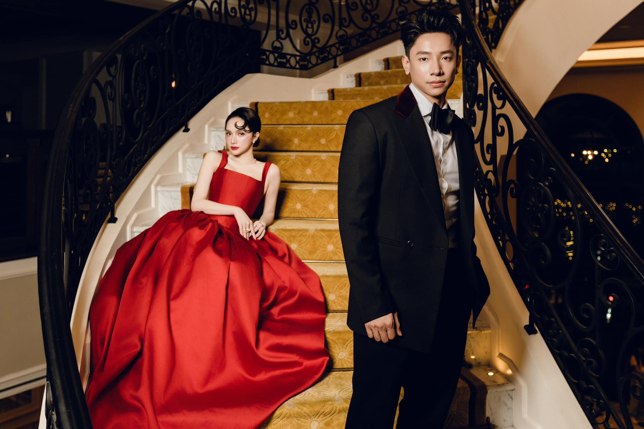 Quoc Anh, an actor, displays easy charm and grace in his beautiful white tuxedo by Kim Bespoke. Standing behind Tieu Vy, he completes an elegant...