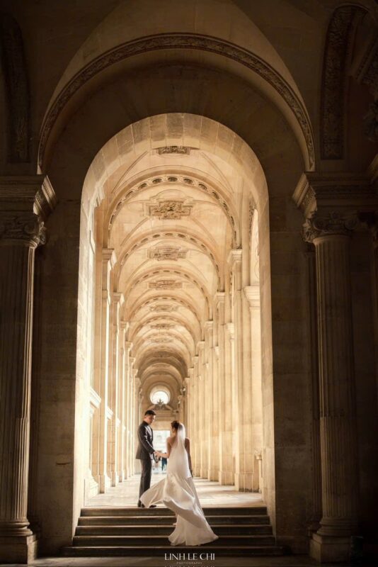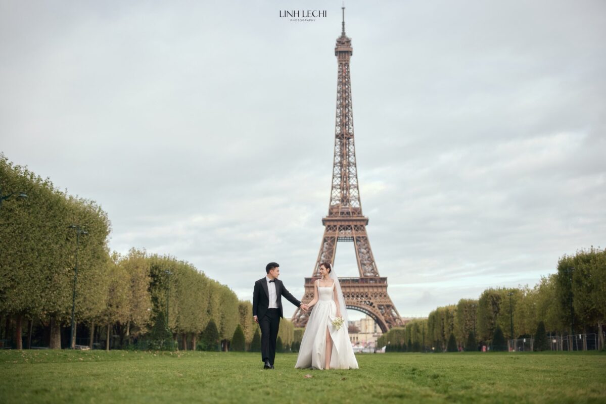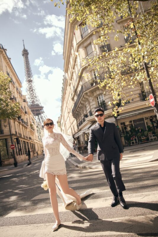 The neutral grey tone blends with Paris’s classic architecture, creating a refined, modern, and masculine composition, a symbol of timeless elegance on his special day.