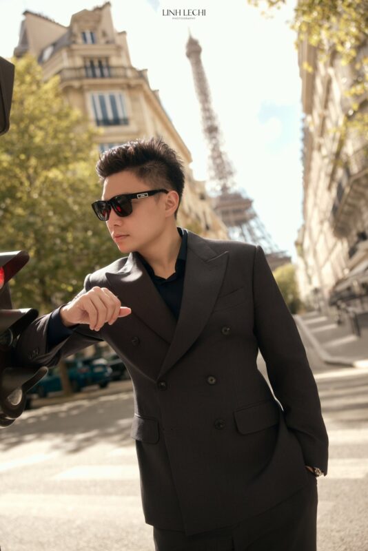 The charcoal double-breasted suit is one of the designs Kim Bespoke created exclusively for Entrepreneur Viết Vương, for his pre-wedding photoshoot in Paris with Miss Đỗ Hà.