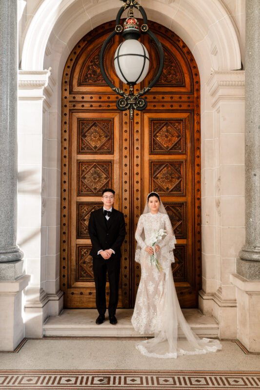 Groom Tom looks elegant with the black three-piece suit in the Flinders Street Station