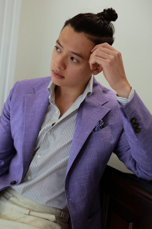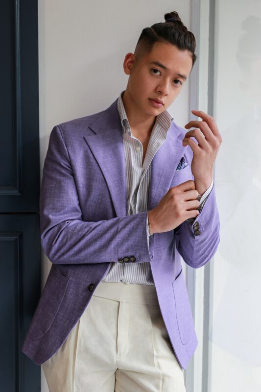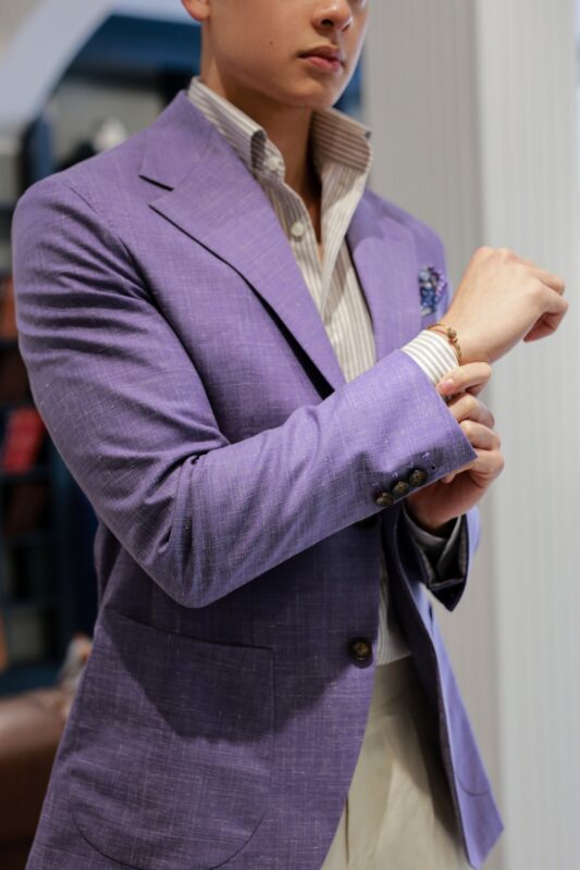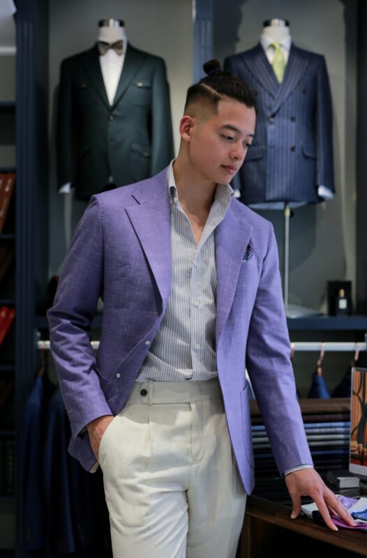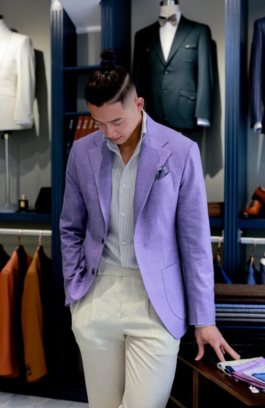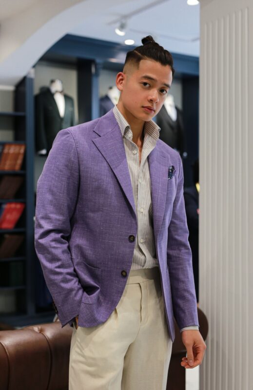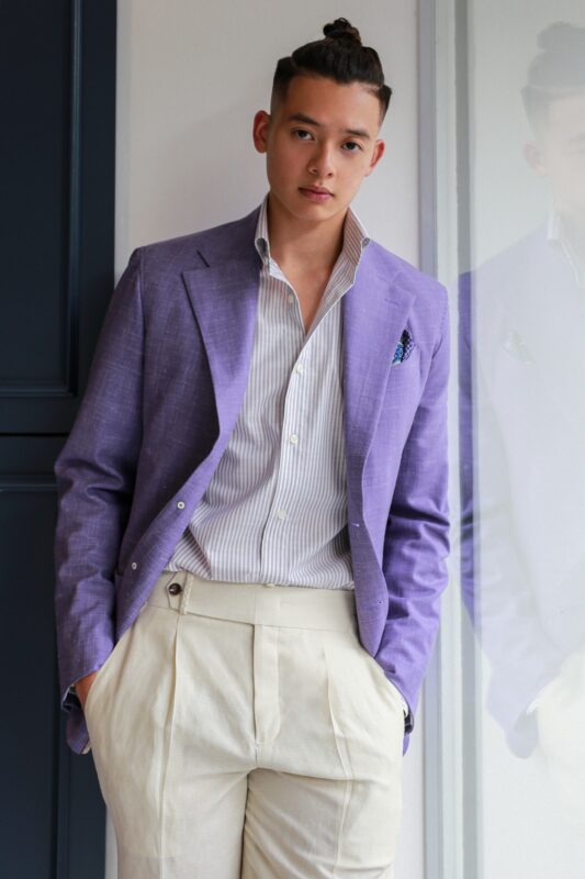 The ensemble features a blue-purple wool–linen–silk jacket, paired with a light grey striped shirt and off-white trousers. The silhouette is neatly tailored, with double side vents, barchetta pockets, and spalla camicia shoulders — a shirt-style shoulder construction that allows the jacket to drape naturally and follow the slope of his frame with effortless softness.