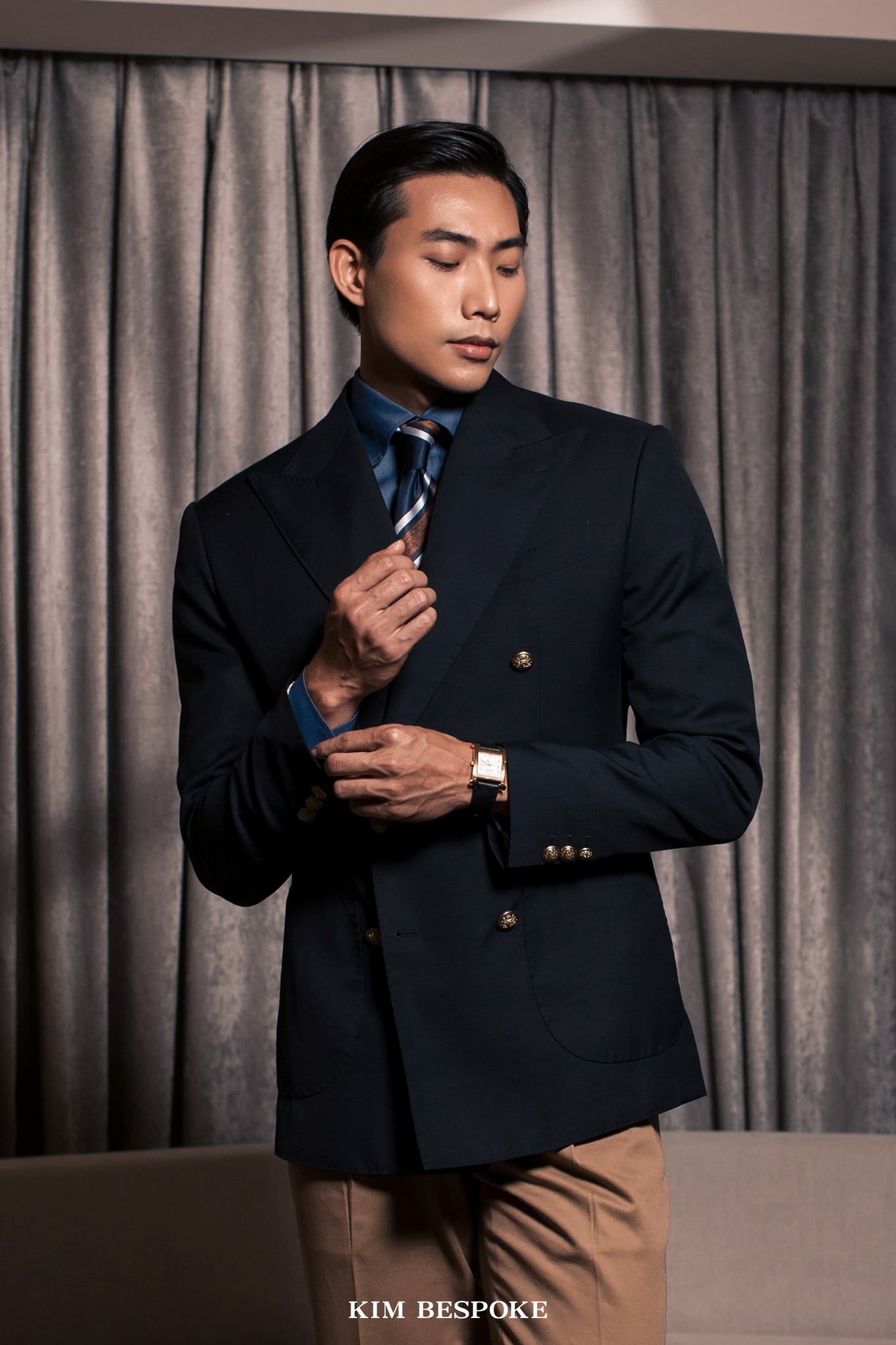 The dark navy KIM jacket paired with khaki Resort Tan trousers creates a refined, confident look — one that exudes both style and reliability. For those who meet you, this combination leaves a lasting impression of composure, integrity, and trustworthiness.