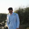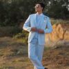 This suit comes in a delicate shade of blue — as if the sea had quietly reflected its hue onto the sky. Crafted from premium linen and hand-finished to maintain a structured silhouette, it remains airy in the sun, gentle on the skin, and light without ever feeling informal.