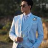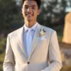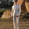 The warm beige tone preserves the softness of morning light — the kind that makes everything feel hopeful. With a refined single-breasted silhouette, tailored in premium linen, the suit holds its structure while remaining light and breathable — perfect for an outdoor celebration where nature itself becomes the backdrop.