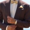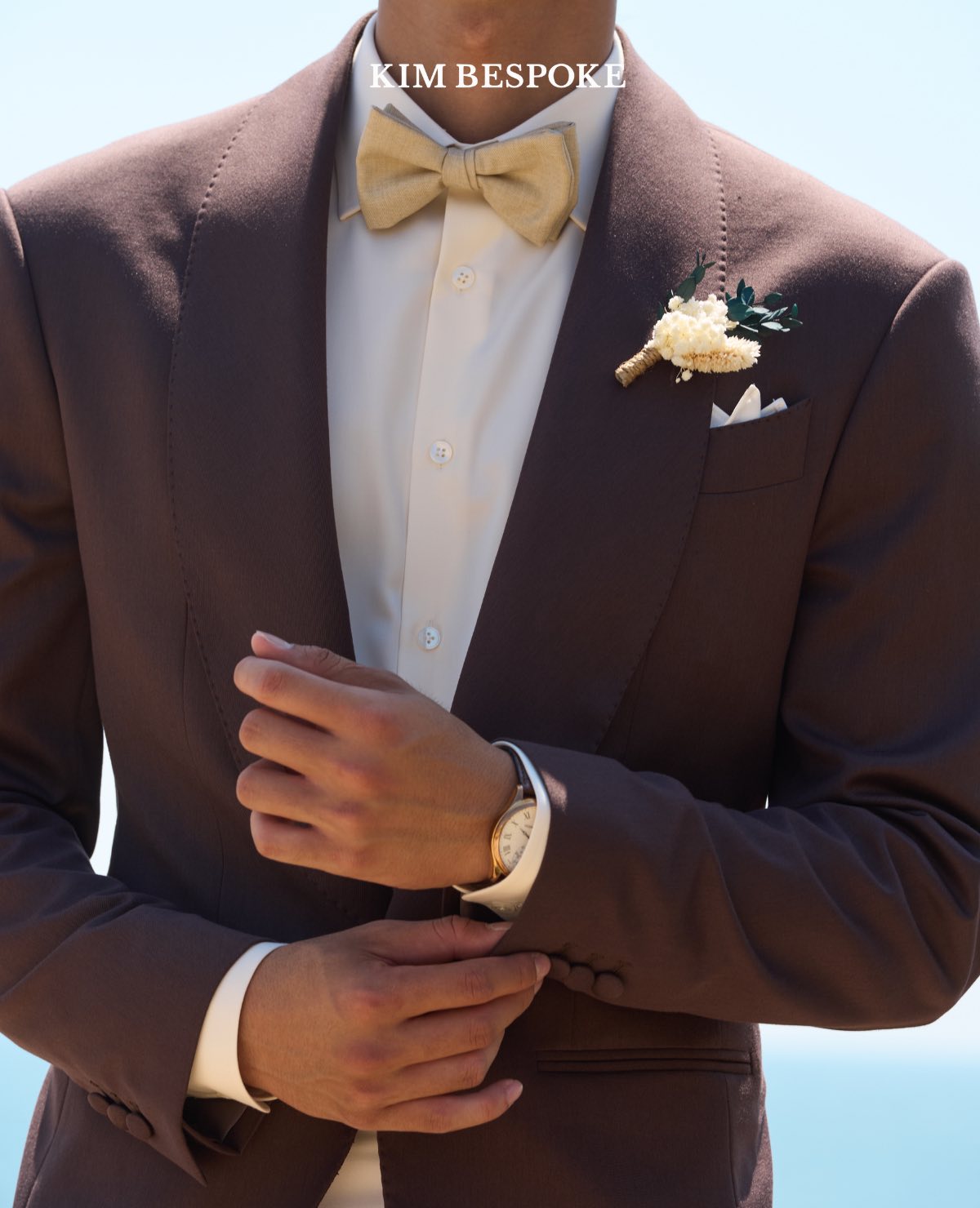 The groom’s look features a classic single-breasted silhouette with a shawl lapel, refined layering that flatters the form while maintaining an effortless ease. The premium wool blend fabric softens the weight of the earth, allowing each movement to flow like the first rays of sun.